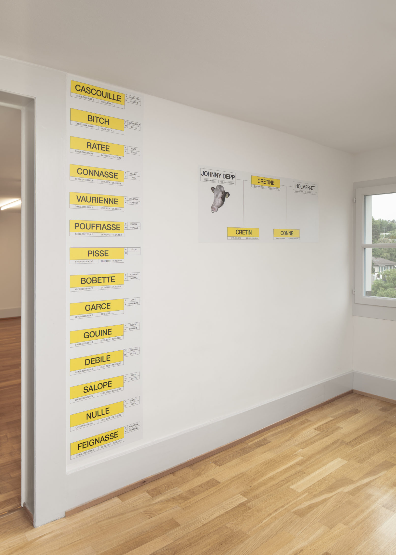 In 1974, Belgian artist Marcel Broodthaers modified two posters produced for agricultural education. Here, the animal farm presents a worldwide search for bulls, whose sperm can be purchased, named after car brands.